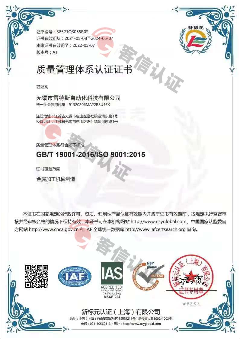 恭喜無(wú)錫市雷特斯自動(dòng)化科技有限公司獲取ISO9000質(zhì)量管理體系證書