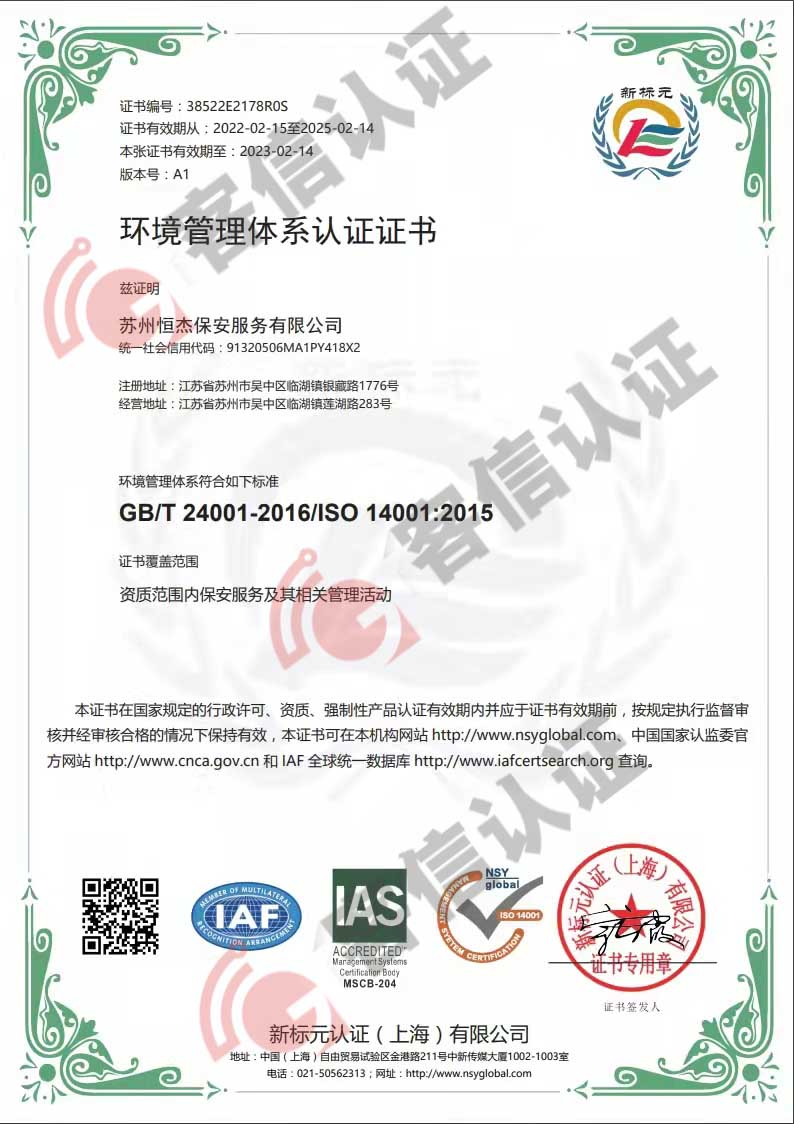 > 恭喜蘇州恒杰保安服務有限公司獲得ISO三體系認證證書