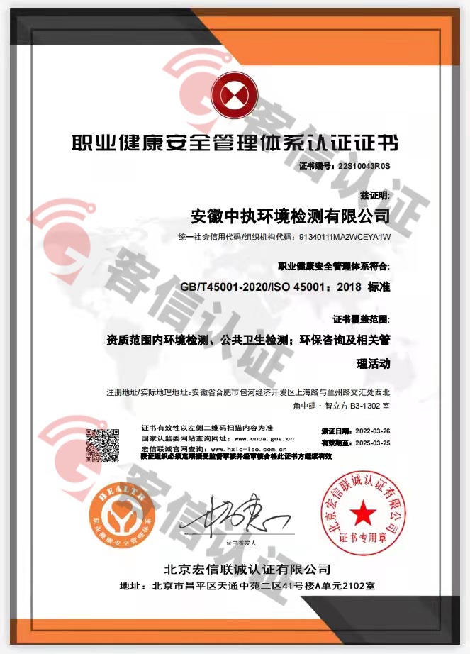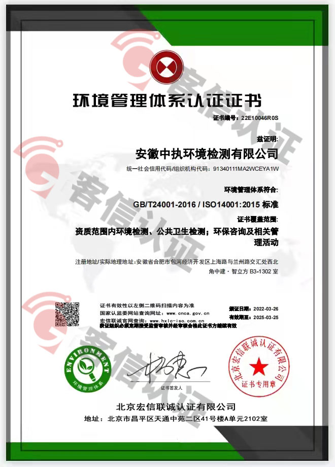 > 恭喜安徽中執環境檢測有限公司獲得ISO三體系認證證書
