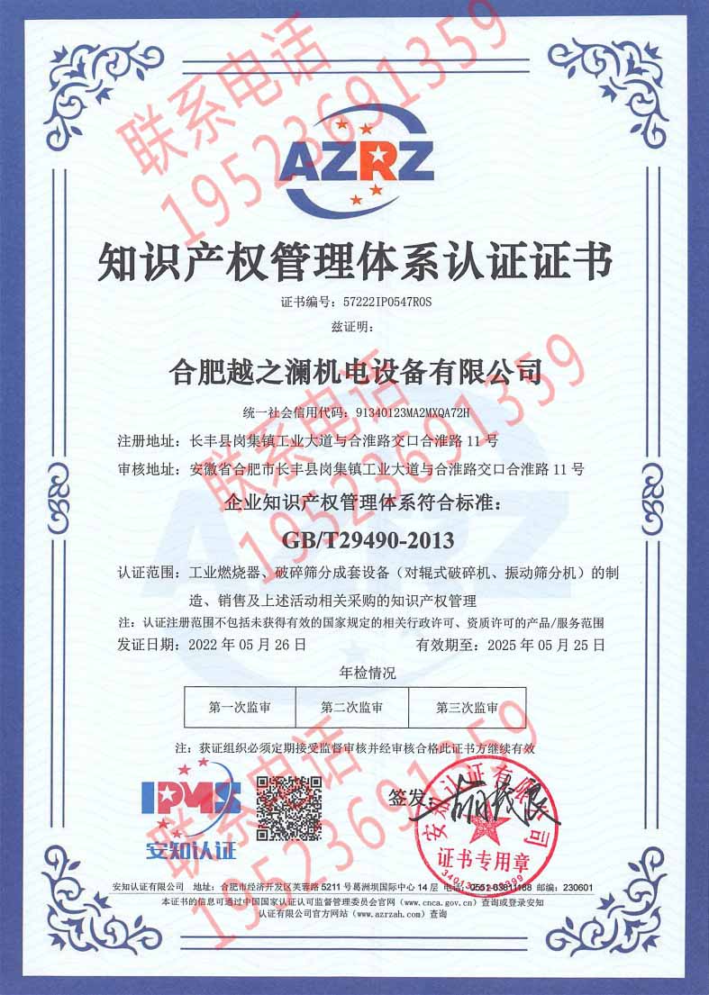 恭喜合肥越之瀾機械設備有限公司獲得知識產權認證證書