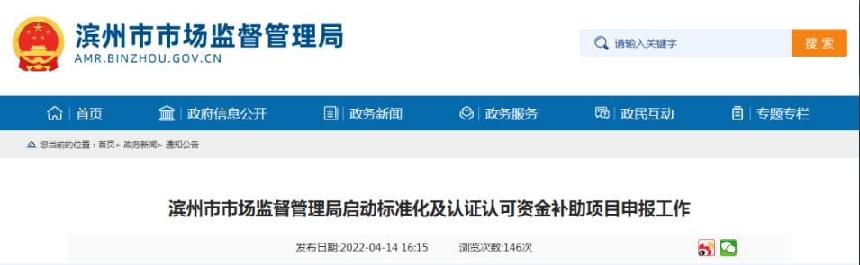 為持續優化營商環境,推動各項惠企政策全面落實,濱州市市場監督管理局依據《濱州市人民政府關于助推“好品山東”建設促進高質量發展的實施意見》和《濱州市品牌培育市級專項資金使用管理辦法》有關規定,啟動標準化、認證認可資金補助項目申報工作。